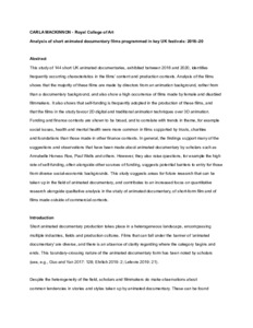 MacKinnon, Carla, 2023, Journal Article, Analysis of short animated documentary films programmed in key UK festivals: 2016–20 Animation Practice, Process & Production, 11 (1). pp. 55-79. ISSN 2042-7875