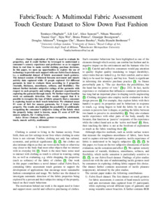 Olugbade, Temitayo, Lin, Lili, Sansoni, Alice, Warawita, Nihara, Gan, Yuanze, Wei, Xijia, Petreca, Bruna, Boccignone, Giuseppe, Atkinson, Douglas, Cho, Youngjun, Baurley, Sharon and Bianchi-Bethouze, Nadia, 2023, Journal Article, FabricTouch: A multimodal fabric assessment touch gesture dataset to slow down fast fashion 2023 11th International Conference on Affective Computing and Intelligent Interaction (ACII). pp. 1-8. ISSN 2156-8111