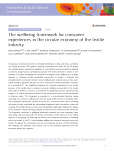Petreca, Bruna, Jewitt, Carey, Fotopoulou, Aikaterini, Golmohammadi, Lili, O'Nascimento, Ricardo, Chamberlin, Lucy, Bianchi-Bethouze, Nadia, Obrist, Marianna and Baurley, Sharon, 2025, Journal Article, The wellbeing framework for consumer experiences in the circular economy of the textile industry Humanities & Social Sciences Communications, 12. pp. 1-14. ISSN 2662-9992