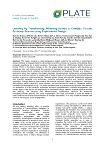 Barrios-O'Neill, Danielle, Ribul, Miriam, Tommencioni, Chiara, Cainy, Yiru Yan, Rungta, Devanshi, Selby, Laura, Ren, Xinyi, Quintana, Claudio, Morrow, Roberta, Lanot, Alexandra, McQueen-Mason, Simon J. and Baurley, Sharon, 2025, Journal Article, Learning by transforming: Widening access to complex circular economy science using experimental design No. 6 (2025): Proceedings of the 6th Product Lifetimes and the Environment Conference (PLATE2025). ISSN 2794-9540