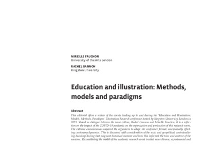 Fauchon, Mireille and Gannon, Rachel, 2023, Journal Article, Education and illustration: Methods, models and paradigms Journal of Illustration, 9 (1-2). pp. 3-14. ISSN 2052-0204